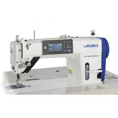 Industrie-Nähmaschine mit Geradstich (Doppelsteppstich Typ 301), normalem Stofftransport, eingebautem elektronischem Motor auf der Oberwelle der Maschine (direct drive), automatischem Fadenabschneider mit rotierender Messerbewegung und einer minimalen Schnittlänge von nur 3 mm, automatischem Fadenwischer, manuellem Rückwärtsschalthebel, zusätzlicher Taste für automatischem Rückwärtstransport, wählbarer automatischer Verriegelung zu Nahtbeginn und Nahtende, automatischer Nähfußlüftung, eingebauter LED-Nähleuchte, komplett mit Tischplatte und Metalluntergestell, geeignet für leichte und mittlere Materialien.