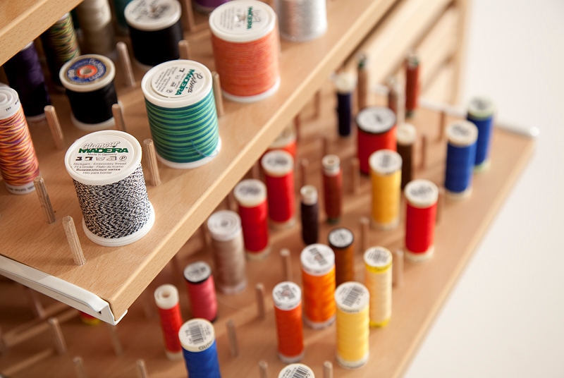 Auf der linken Seite befinden sich fünf ausziehbare Böden, jeder mit 260 Bohrungen zum Einsetzen der Garnrollenstifte.