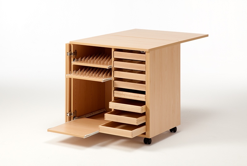 Oben links sind zwei weitere ausziehbare Böden, jeder mit 260 Bohrungen zum Einsetzen der Garnrollenstifte.
