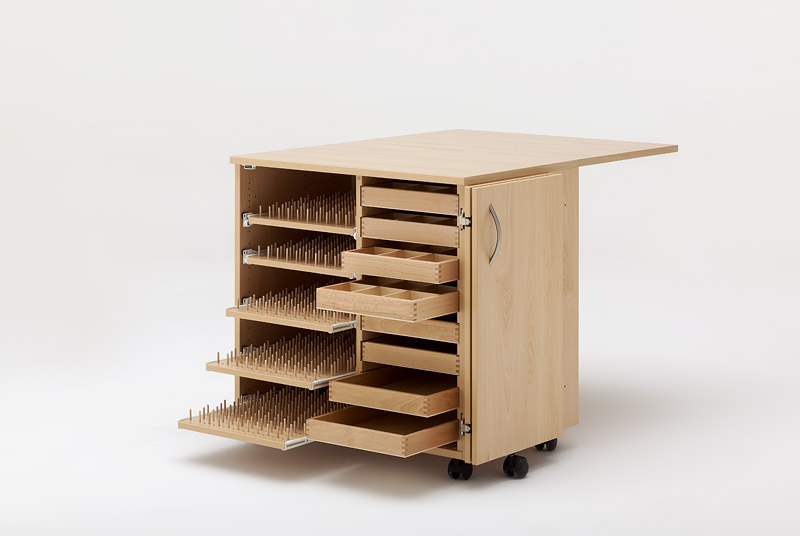 Auf der linken Seite befinden sich fünf ausziehbare Böden, jeder mit 260 Bohrungen zum Einsetzen der Garnrollenstifte.