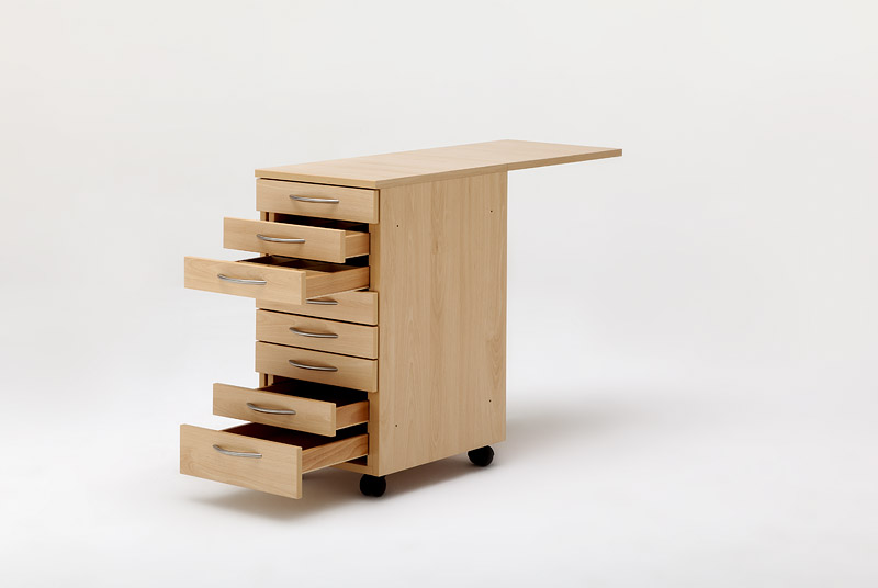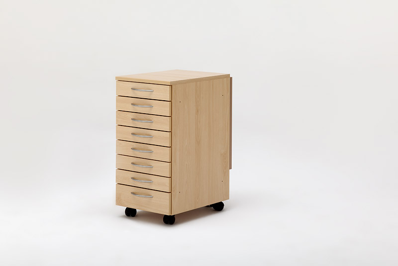 Dieses Möbel mit acht Schubladen kann man auf der rechten wie auch auf der linken Seite eines anderen Möbels beistellen.